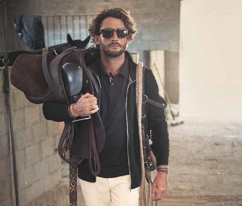 Men’s modern fit piqué polo in combed cotton with contrasting tape at neck, placket, side vent and loop at sleeve end. Bicoloured buttons. Contrast colour at reversed side collar.